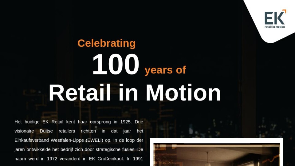 Vandaag de dag is EK met trots al 100 jaar een netwerkhub tussen retail en industrie - en dient het bedrijf in Nederland, Duitsland en Frankrijk nu als inkoopcoöperatie, marketingorganisatie en competentienetwerk.
